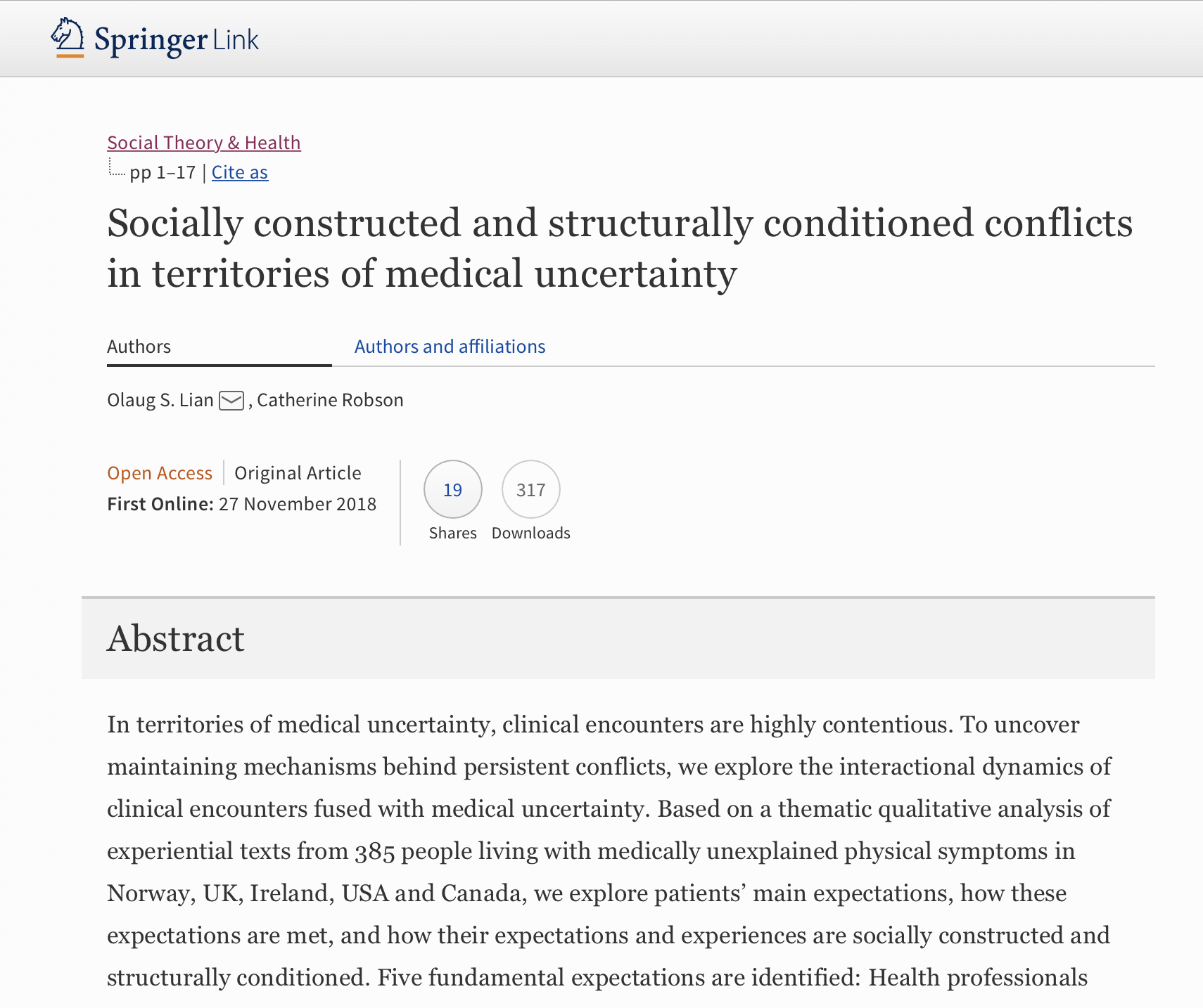 Lian OS, Nettleton S, Wifstad Å and Dowrick C (2021) Modes of Interaction in Naturally Occurring Medical Encounters with General Practitioners: The ´One in a Million´ Study. Qualitative Health Research 31(6): 1129-1143. https://doi.org/10.1177/1049732321993790