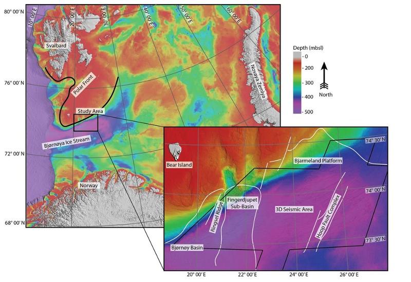 Leirdjupet Fault Complex is located in Bjørnøyrenna/the Bear Island Trough in the Barents Sea. Bjørnøyrenna was carved out due to ice streams during the northern hemisphere glaciations, so the seafloor is full of marks related to ice activity like ploughmarks and glacial lineations. Along the northern margin of Bjørnøyrenna, the warm and salty Atlantic water transported by the North Cape Current meets the chilly Arctic waters flowing south. This meeting of waters defines the Arctic Front and the (modern) marginal ice zone. The marginal ice zone marks the southward extent of the ice edge during winter under present day conditions. CAGE expeditions show significant natural methane seepage along the Leirdjupet Fault Complex.