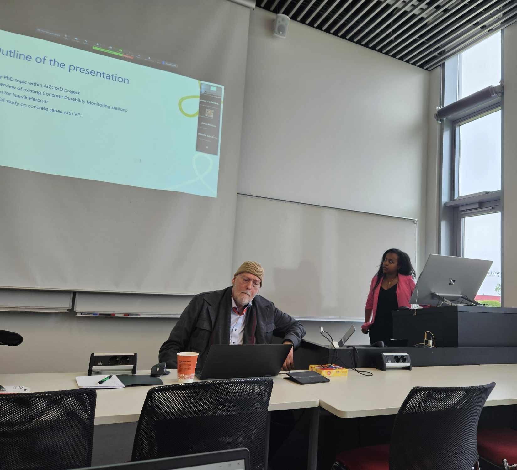 The presenters were Adeolu Adeiran from University of Oulu Finland. He presented online on the potential alternatives for local binder and aggregate materials. He discussed alternative aggregates and SCMs available in the nordics and his main findings. Ingrid Jondahl from Heidelberg Materials Sement Norge, presentsed in person on volcanic pozzolan iceland in low carbon concrete. She presented the ongoing projects with volcanic pozzolan iceland (VPI) and results form mortar testing with VPI. Jonas Nielsen from Permagreen Grønland A/S presented online on a traditional mixing and regulations in Greenland. He discussed the construction industry and concrete production in Greenland. Professor Olafur Wallevik from Reykjavik University presented in person on frost resistance of low carbon concrete. He discussed evolution of eco-concrete at Rb and frost resistance of low carbon concrete. Magdalena Rajczakoska from Luleå University of Technology, presented online on how can enhance accelerated freeze and thaw testing for low-carbon concrete. She presented freeze-thaw testing methods, different curing conditions, experimental procedures and data analysis. Einar Einarsson from BM Valla ehf,IS presented in person on freeze-thaw resistance of low carbon concrete and effect of carbonation and air content. He discussed concrete in Greenland, Icelanding building regulations on freeze-thaw test specifications, Effect of carbonation on freeze thaw resistance and entrained air and also the continuing work in freeze thaw and low carbon concrete. Jonas Carlsward from Heidelberg Materials Sweden AB, SE who presented online on Freeze thaw testing of low carbon concrete according to SS137003. He discussed low carbon concrete limitations, freeze-thaw resistance of low carbon concrete and freeze-thaw test methods according to SS 137003. Rekik Derso from UiT The Arctic University of Norway presented in person on Long-term durability monitoring station establishment at Narvik harbour. She discussed overview and historical development of existing Concrete Durability Monitoring stations, plan for narvik harbour and intial study on cocncrete series with volcanic pozzolan iceland (VPI).