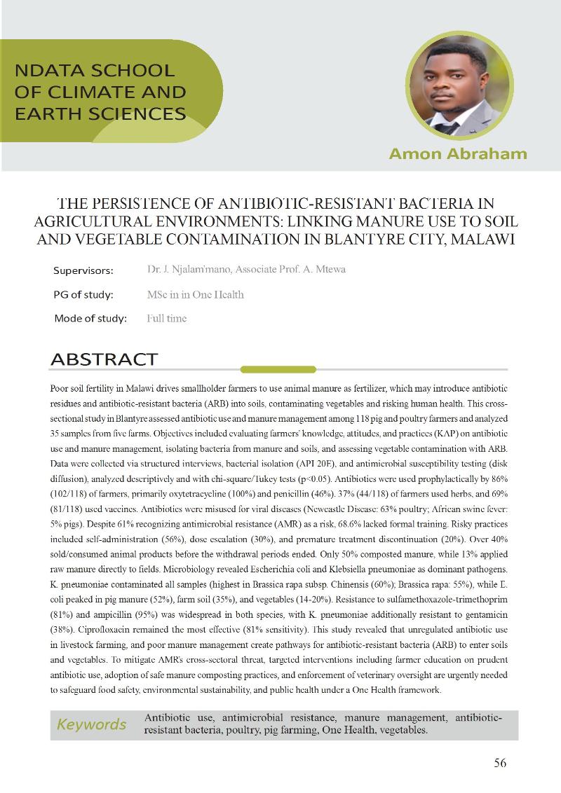 Abraham A, Mtewa AG, Chiutula C, Mvula RLS, Maluwa A, Eregno FE, Njalam'mano J. Prevalence of Antibiotic Resistance Bacteria in Manure, Soil, and Vegetables in Urban Blantyre, Malawi, from a Farm-to-Fork Perspective. International Journal of Environmental Research and Public Health . 2025; 22(8):1273. Here