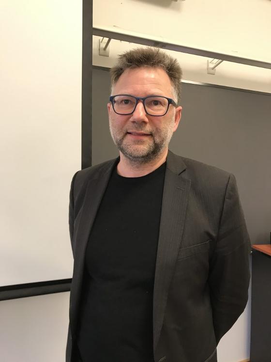 Førsteamanuensis og filosof Øyvind Stokke leder prosjektet Interdisciplinary Carbon Capture and Utilisation (iCCU), som studerer og analyserer samspillet som oppstår i prosesser for nyttegjøring av CO2-utslipp fra ulike faglige vinklinger. Her med Husøy i bakgrunnen.