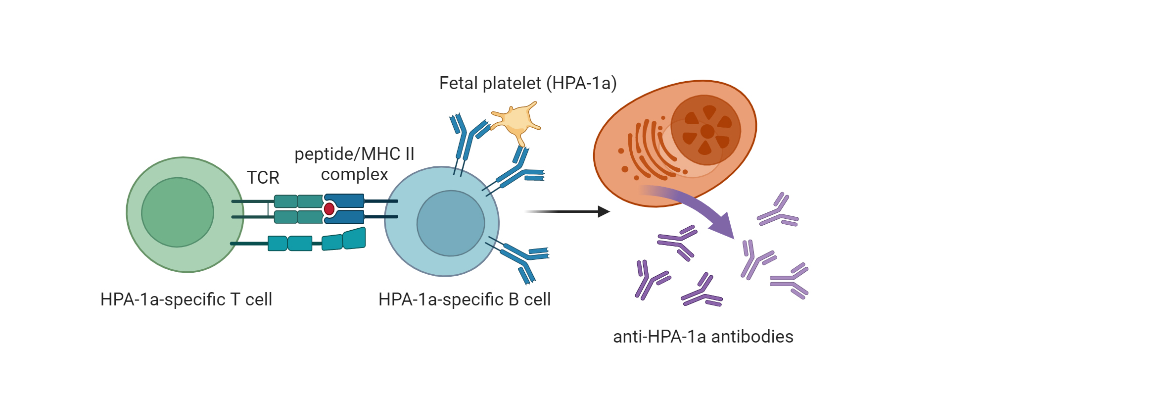Alloreactive CD4+ helper T cells recognize the HPA-1a peptide presented in the DRA/DRB3*01:01 molecule. This may stimulate the anti-HPA-1a-specific B cells and subsequently induce plasma cells to generate anti-HPA-1a antibodies that can target the fetal antigens. Figure created with Biorender.com.