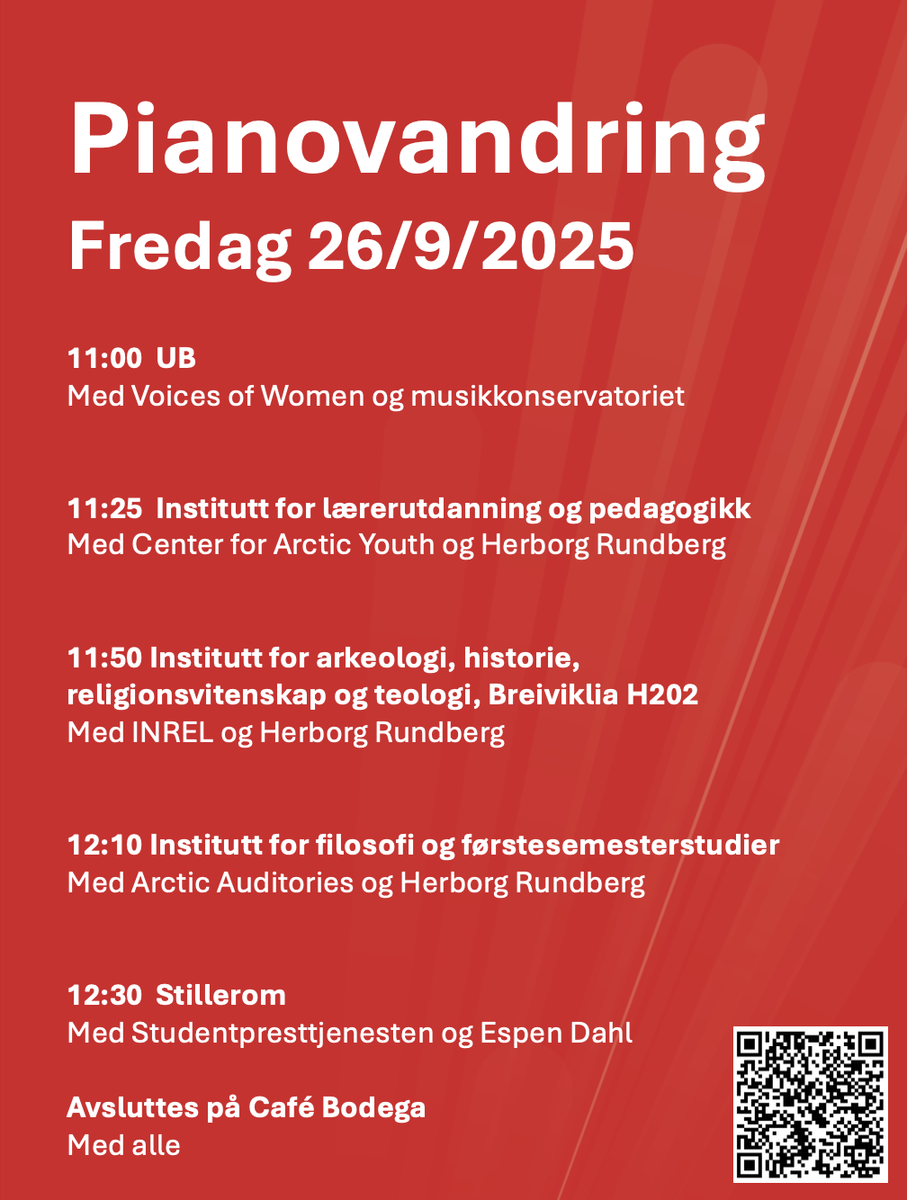 Du kan bli med deler eller hele vandring, lytte til musikk og korte fortellinger om forskningsaktiviteter ved stedet. Formål med vandringen er å synliggjøre humanioraforskning ved UiT. Vandringen arrangeres i regi av Senter for arktisk humaniora og er åpent til alle som vil være med på en usedvanlig lunsjpause.