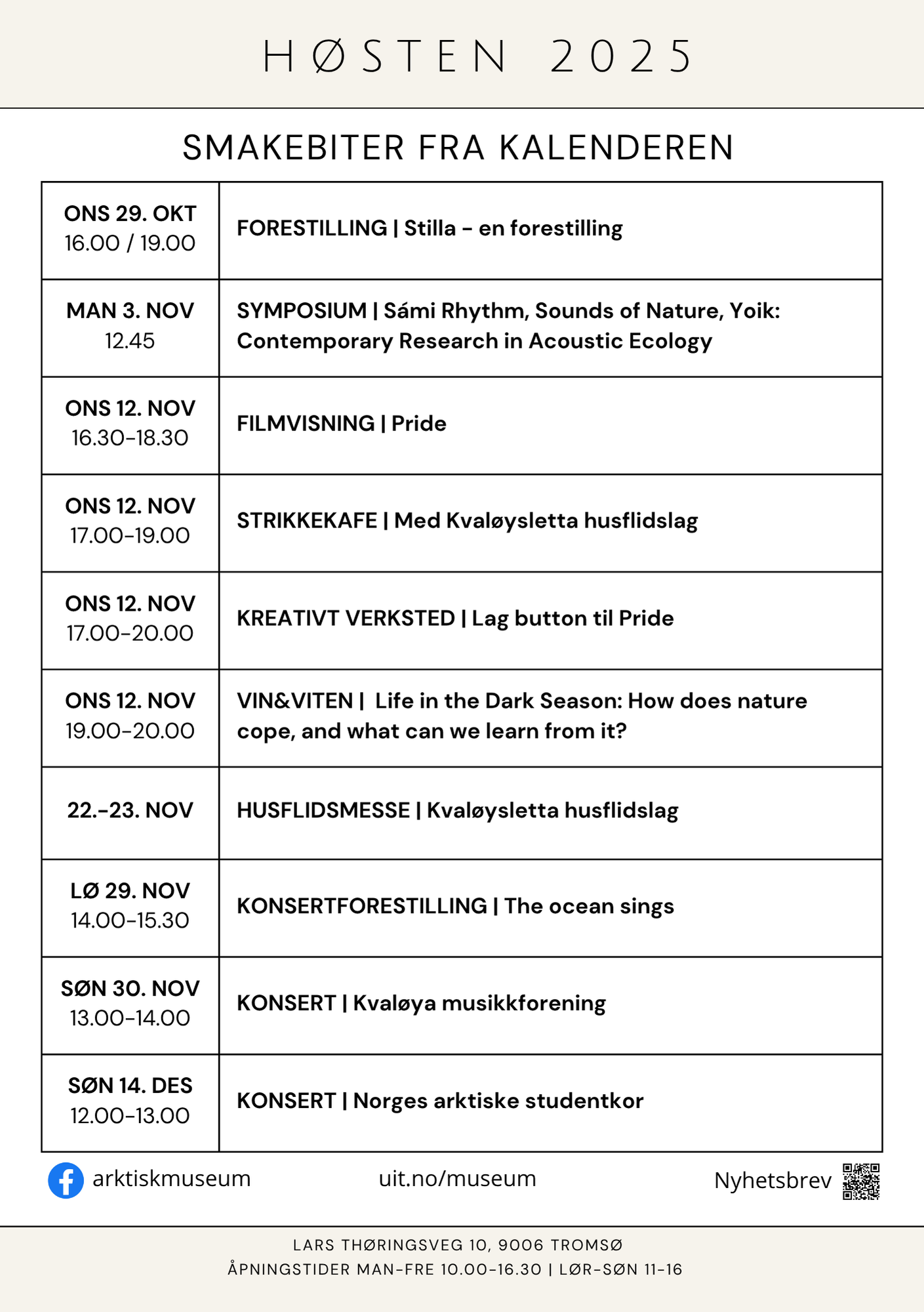 Barneaktiviteter, omvisninger, film, kreative verksted, diskusjoner og mer til - høsten ved museet byr på noe for enhver smak. Arrangementsprogrammet utvikles og oppdateres fortløpende. Følg med i våre kanaler for siste nytt.